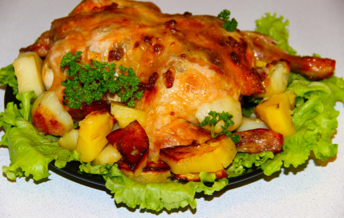 Курку, приготовану в духовці, можна доповнити чудовим блюдом з молодої картоплі, тушкованої в сметанному соусі. Ніжне і смачне частування має приємний вершковий смак, ідеально підходить до запечене м’яса.